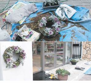 (写真上)制作中 (写真下)はハボタン・アリッサム・這い性白妙菊を寄せ植えし