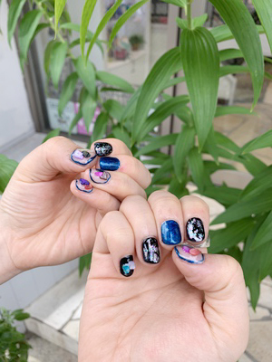 ベースは黒とブルーで深みのあるお色ですが、クリアにストーンをのせた事で夏らしく涼しげなネイルに仕上がりました‼︎