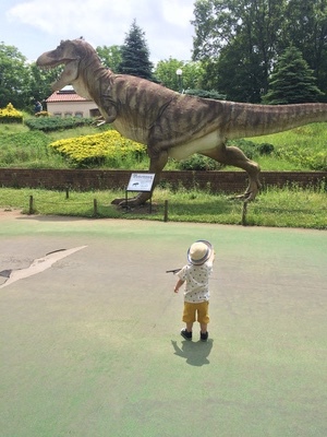 歩いていると、なんと大きい恐竜がいましたぁ!子供が最近、恐竜の真似