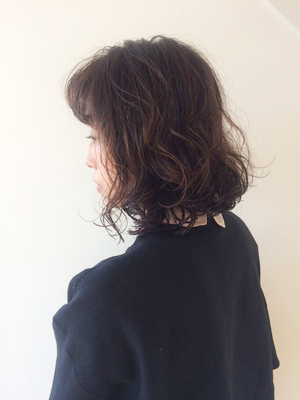 全体的に緩やかなパーマをかけて、前髪にもくるっと、パーマをかけて、