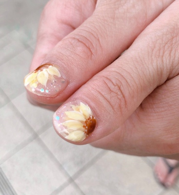 白ベースが定番のヒマワリも、クリアで涼しく♡1/2のヒマワリでも存在感があるし、手描きなので小さな爪でもお客様サイズに合わせて楽しめるデザインです!