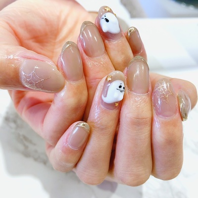 前回に引き続き、ハロウィンネイルです!ベージュベースで、蜘蛛の巣もゴールドなのでさりげなく楽しみたい方におすすめ♡オバケは3Dで立体にしました☺︎