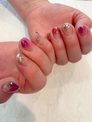 ゴールドのグラデーションと色鮮やかニュアンスネイルをミックスさせて。ゴールドを散りばめました!