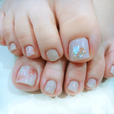 かかとは角質ケアしてふわふわに♡爪先はジェルでつやつやに♡フットメニューもおまかせ下さい!今年はアシンメトリーなデザインも人気です☺︎