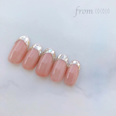 最近SNSでもよく見かけるガラスフレンチネイル、フロムでもとても人気で、お問い合わせも多いデザインです♡ラメフレンチの上に、さらにキラキラをのせているので反射がめちゃくちゃキレイ☺︎