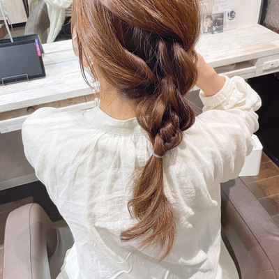 下の段の髪を最初に三つ編みして毛先で結びます。