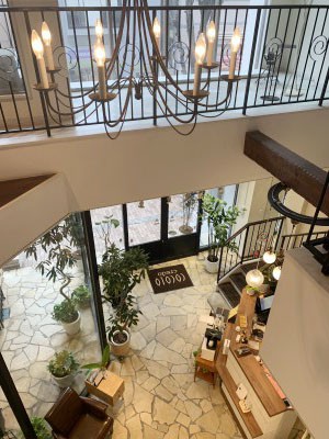 吹き抜けに面した階段で2階に上がって1階のフロントを見るとこんな素敵な店内を見ることができます♡