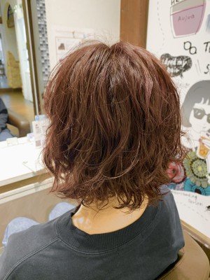トップからくしゃっとかけたパーマに秋らしい暖色カラーで遊びのあるおしゃれボブスタイル◎