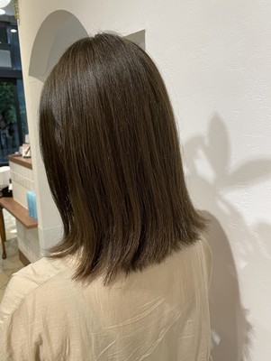 元の髪色がそこまで明るい訳ではなかったため、一度ブリーチではない薬剤で明るくしてからオリーブ系の薬剤を載せさせていただきました◎