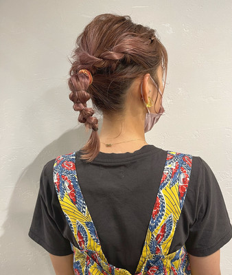 サイドをネジったポニーテールの先を三つ編みにして数本のゴムでグルグルに◎◎◎