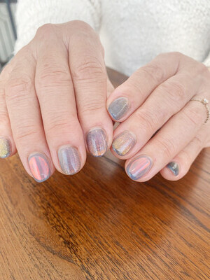 マグネットとフィルムを入れて色々な角度から色々なお色に見えるニュアンスネイルにしてみました。