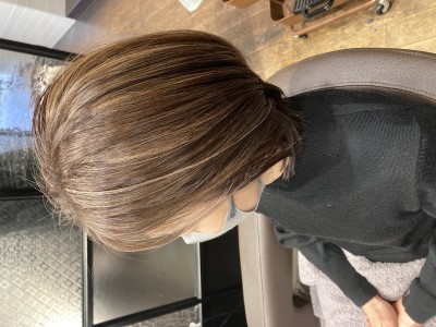 白髪ぼかしハイライトです。白髪染めをして1ヶ月ほどすると、根元のリタッチが気になりますよね。 そこに縦のラインのハイライトを入れ、ファッションカラーで染めることで、根本が伸びても気になりにくい。という技術です。 白髪は全然染まらなくても良い。いや、白髪は染めたい。