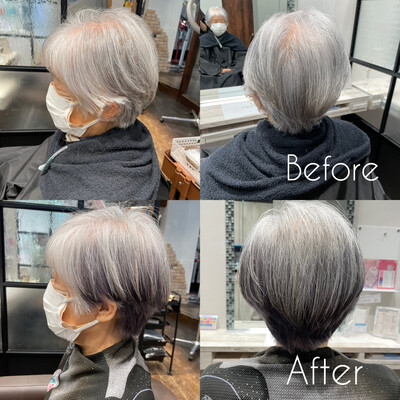 最近、大人のお客様の白髪を目立たなくさせるファッションカラーや、ハイトーンカラーが人気ですが、今日の写真のお客様は全体の白髪にカラーをさせていただいたお客様の写真です!