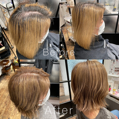 今回の写真は前回全頭をブリーチして明るくしたお客様の写真です。今回は明るさを生かして、ハイライトの部分と少しトーンを落とす部分とで色を分けて染めさせていただきました!