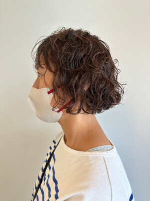 ミニボブにパーマを根本からかけてカーリーヘアー!軟毛の方など根本からしっかりかけてあげると根本も立ち上がりスタイリングしやすくなります。梅雨、夏の時期にパーマは最適です!是非ご相談ください。