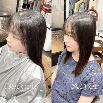 前髪はかけたことはなく、後ろは春頃に一度かけていたので、伸びてきたところの縮毛矯正をかけさせていただきました。