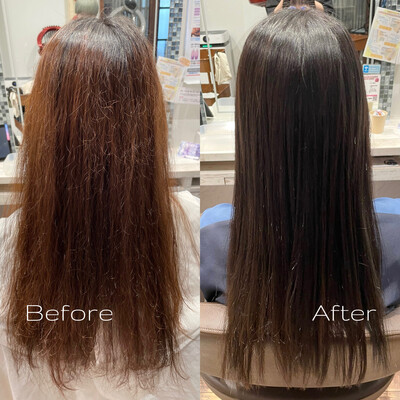 そういった方に今回の写真はナチュラルな縮毛矯正の写真です。今回の写真のお客様は広がるから毛量を取りたいといったお悩みのお客様でした。