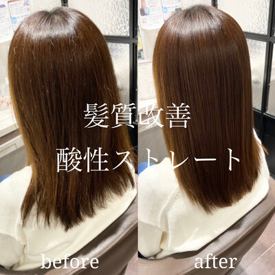 今回の施術内容は、酸性ストレートを使用した髪質改善です。