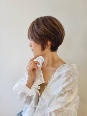 大人ショートボブスタイルにカラーは、ブリーチハイライトを入れて、春新色のシェルアイスをいれましたあ!肌映えとグレージュを両立して、濁らず、沈まず、透明感が出るカラーになっております。是非、春イメージチェンジはいかがですか?