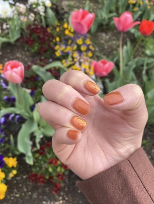 ネイルはクリアオレンジをベースにミラーでうるツヤに。
