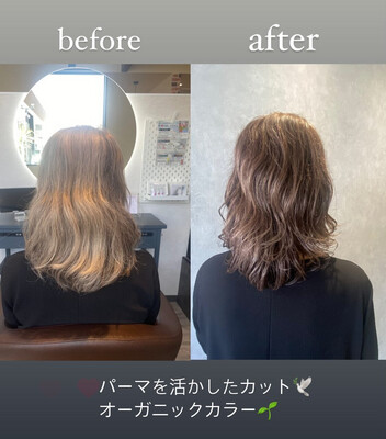 オーガニックカラーは植物の天然オイルがたくさん入っている為とてもツヤがでます!そして通常のカラーの10分の1のダメージで染められますので地肌や髪への負担がかなり少なくカラーが楽しめるんです◎