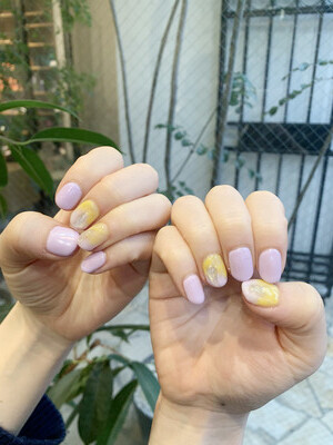 今回はパープルとイエローのニュアンスネイルです。クリアを混ぜながら、ビー玉の様なマーブルを描きました。