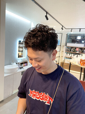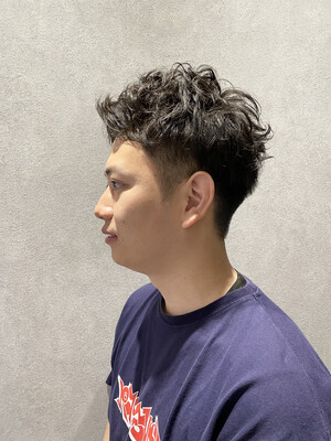 刈り上げと上の毛のメリハリが出るようにカットさせていただいて、パーマはワックスをつけるだけで動きが出るように巻いております。