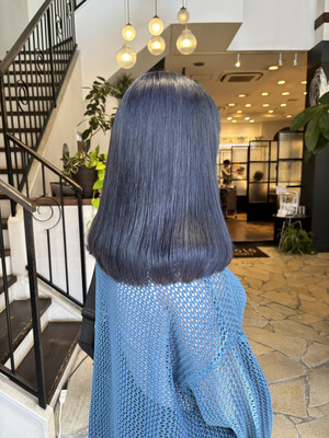 ブルーカラーの褪色が緑っぽくなってしまうとの声を聞きますが、ミルボンから出ているエノグというカラー剤を使ってグレーに色落ちをしてくれるようなカラーレシピで染めています^^