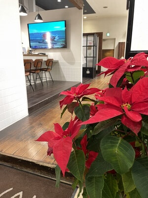 店内ではクリスマスソングと鮮やかなポインセチアで明るい雰囲気になっております。
