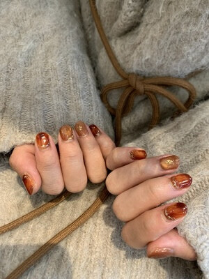 深みのあるブラウンにニュアンスのゴールドを入れて秋らしく仕上げました。