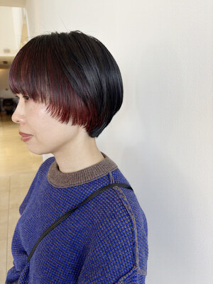 マッシュカットに、インナーに、以前入れたブリーチが、あるので、アディクシーカラーのボルドカラーを入れました!お顔周りにいれたので、印象が明るくなります!