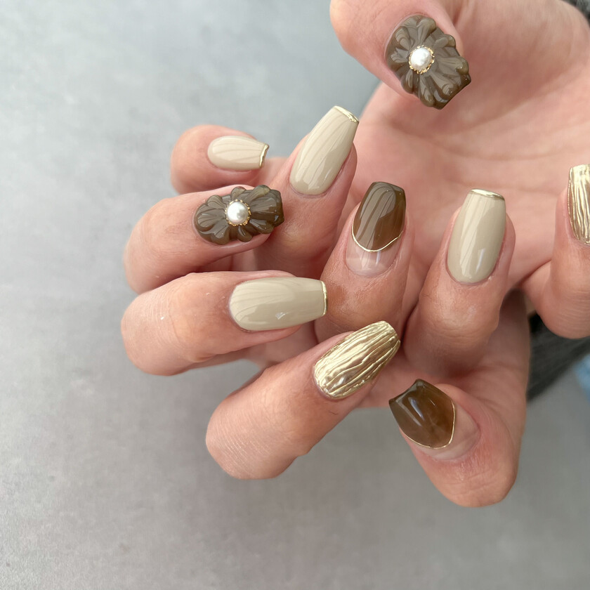 ゴールドとブラウンで可愛すぎないデザインに。