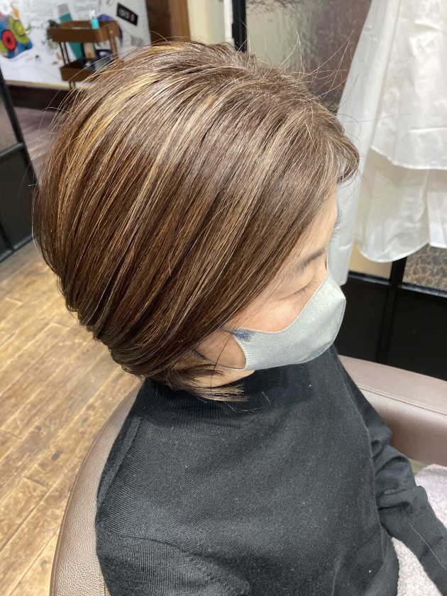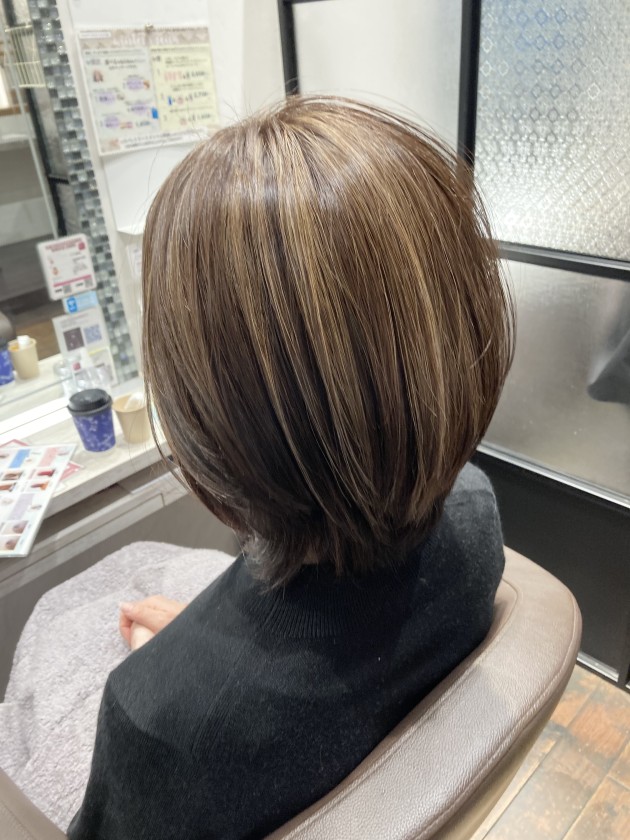 白髪ぼかしハイライトです。白髪染めをして1ヶ月ほどすると、根元のリタッチが気になりますよね。 そこに縦のラインのハイライトを入れ、ファッションカラーで染めることで、根本が伸びても気になりにくい。という技術です。 白髪は全然染まらなくても良い。いや、白髪は染めたい。