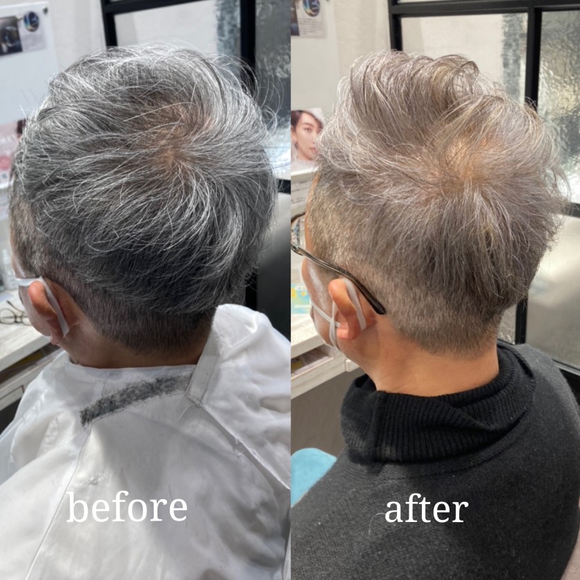 白髪のある男性の白髪ぼかしカラー。細かいハイライトを入れてから、うっすらと白髪にグレーが入るようにカラーリングすると、おしゃれなグレイヘアーになります。これは白髪の率が7割以上の方にご提案するカラーリングになります。