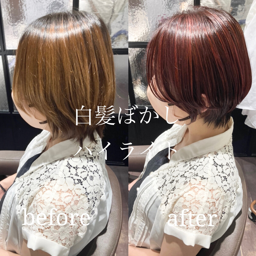 今回のお客様の白髪ぼかしハイライトの色味は、レッド系。