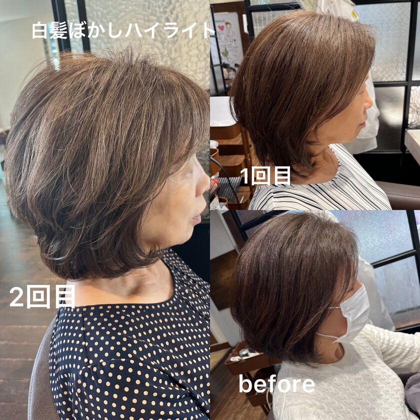 ハイライトを入れる前より伸びてきた白髪が目立ちにくくなってきたと気に入って頂いています♪