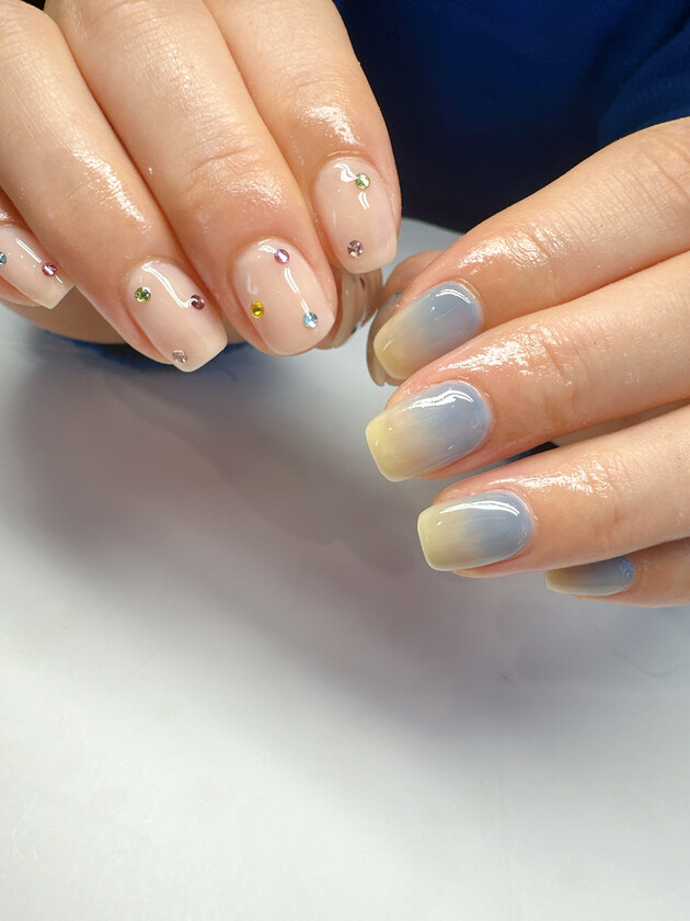 2色のグラデーションとシンプルなラインストーンデザインのちぐはぐネイル♡