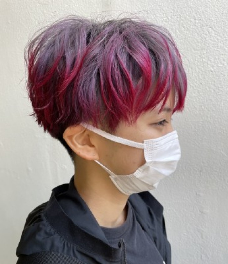 根本、中間はシルバー、毛先は赤を乗せています。ちなみに、根本のシルバーと中間のシルバーは薬剤を変えて馴染むようにしています。 思い切ったデザインカラーはやはり楽しいですね!!