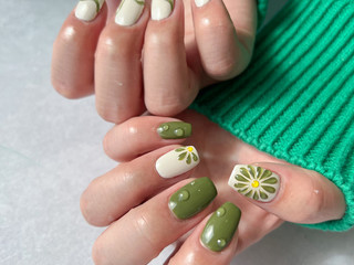 鮮やかなグリーンのマグネットネイル 太陽の光でキラキラ綺麗に輝きます