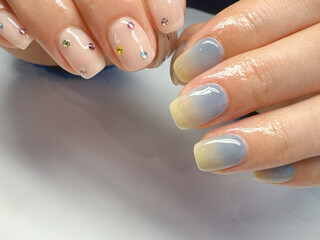 2色のグラデーションとシンプルなラインストーンデザインのちぐはぐネイル♡
