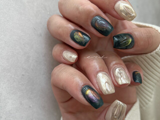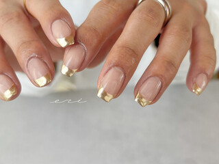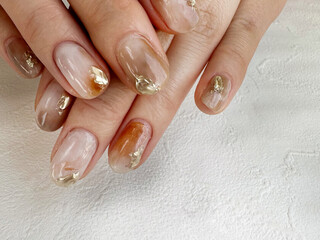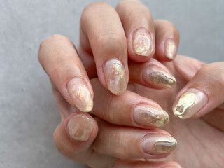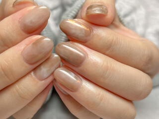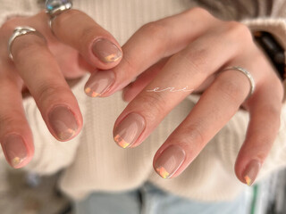 イエローベージュのワンカラーネイル。大人っぽい仕上がりに。