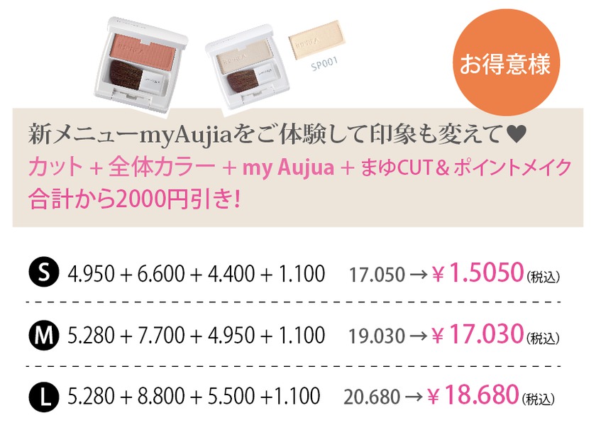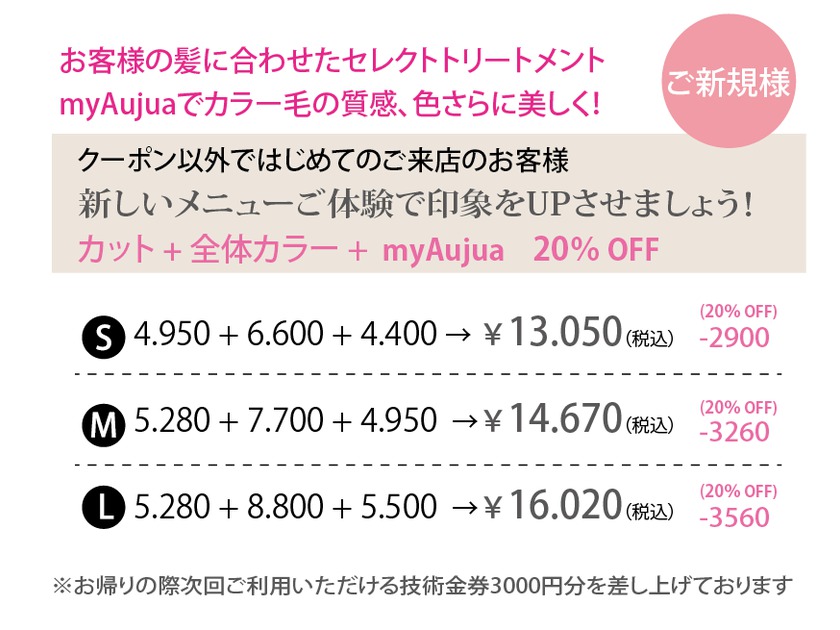 はじめてのご来店で全体のカラー・カット・パーマが20%OFF! さらに髪の質感や色持ちを最大限に引き上げながら、それぞれのお客様の髪にあったケア剤をカスタマイズするMy Aujuaも20%OFFした、スペシャルセットです。極上の美容タイムをフロムでご体験下さい。