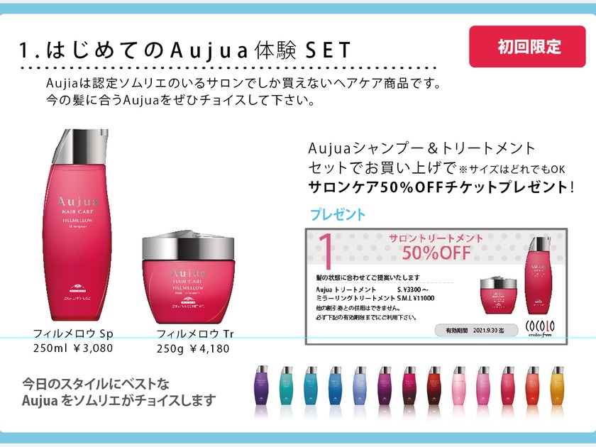 1.まだAujuaホームケアシャンプー&トリートメントをご利用でないお客様のためのセット商品です。