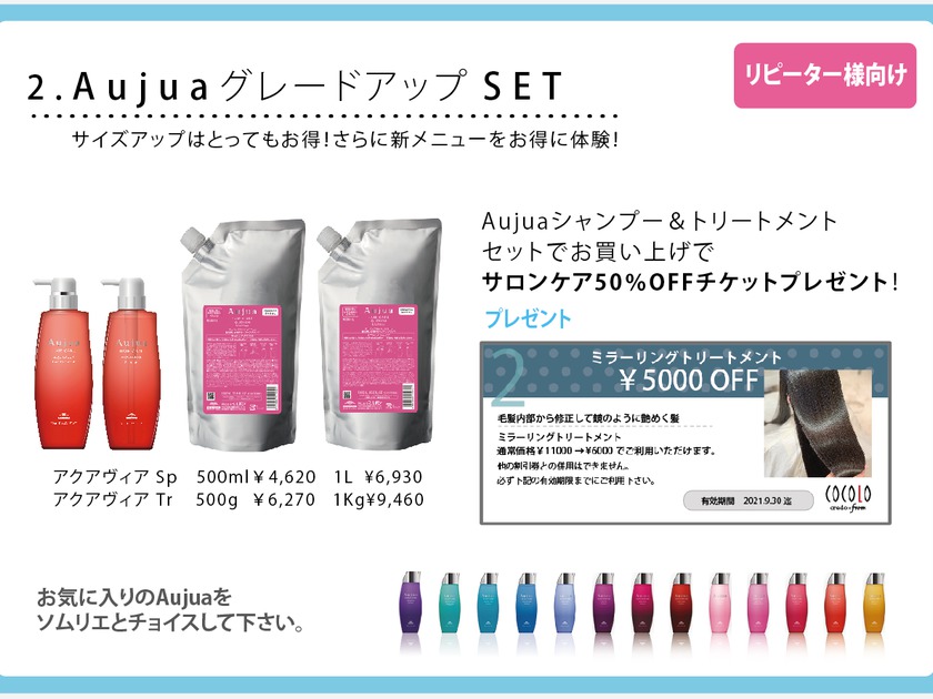 2.いつもAujuaをご利用いただいているお客様は詰替え用や500mlがお得ということはご存知かと思いますが、今回はさらに新メニュー「ミラーリングトリートメント」が 50%OFFでご利用いただけるチケット付。鏡のようにツヤツヤの髪に生まれ変わります。