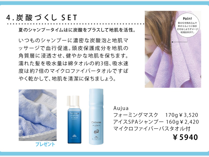 4.夏の爽快セット。ひんやりと地肌を爽快に洗い上げてくれる泡の炭酸シャンプー2種。濡れた髪は早めに乾かしていただきたいからマイクロファイバータオルをセットにしました。