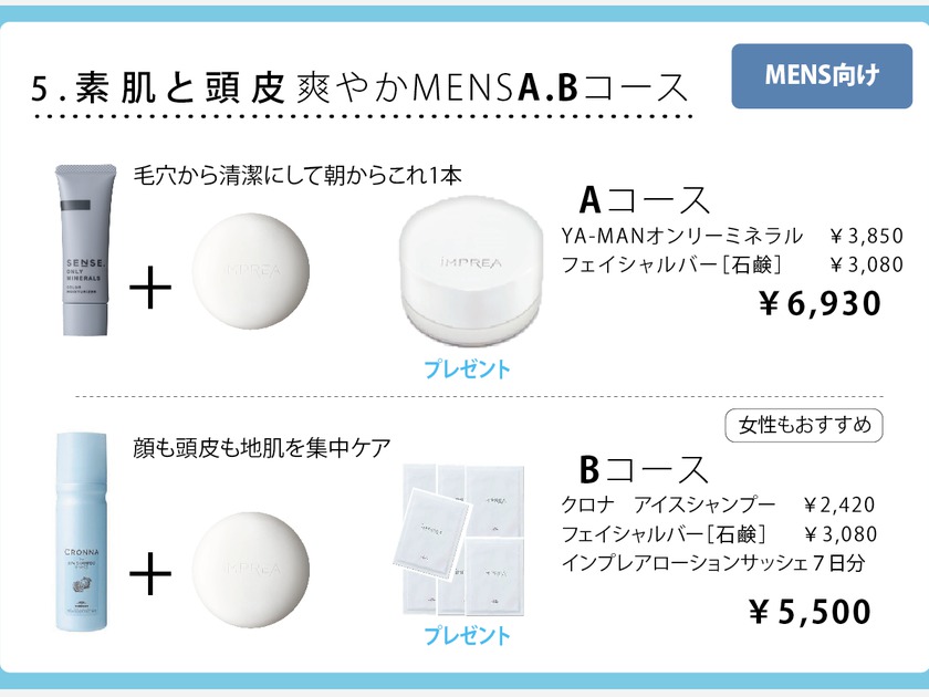 5.男性ファンデーションを気軽にご利用いただきたい。キレイな素肌や夏の頭皮をスッキリ清潔に保つセットです。贈り物にもどうぞ!