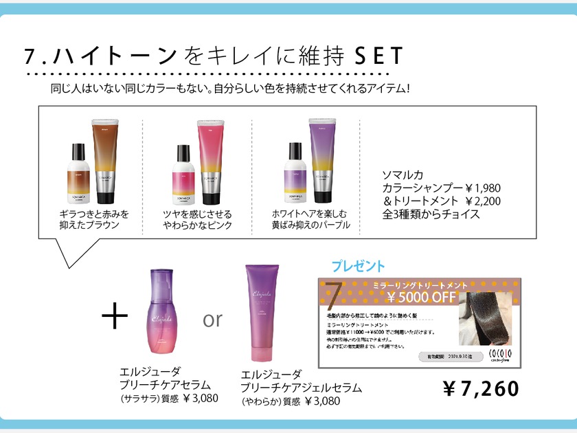 7.美しいハイトーンのためのセット商品です。シャンプー&トリートメントとアウトバスでこの夏は潤いたっぷりでぱさつき知らずのハイトーンヘアを目指しましょう。