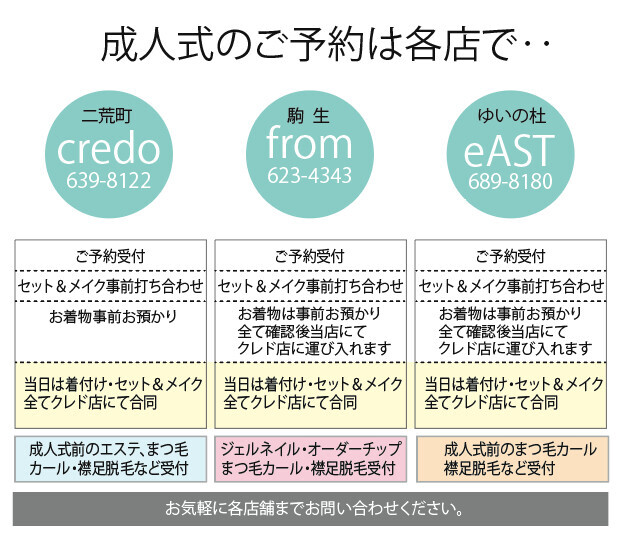 当日の着付けやセットメイクの会場は各店合同となり、クレド店にて行います。