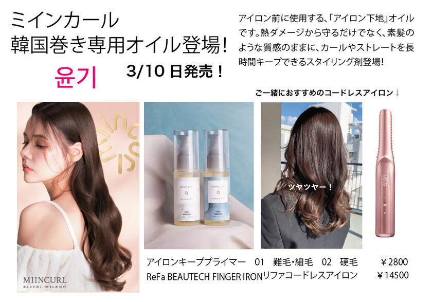 チュルンと毛先に引き締めカールの韓国ヘアーが人気!顔まわりカットが言うまでもなく重要でショートもミディアムもサイドの毛が後ろに流れるようにコテやアイロン巻きで仕上げて毛先をチュルンと巻き上げます。そこで今回発売のオイルが大活躍!ダメージレスの上1日きれいにカールをキープしてくれます。ココロスタッフが絶賛オススメです。