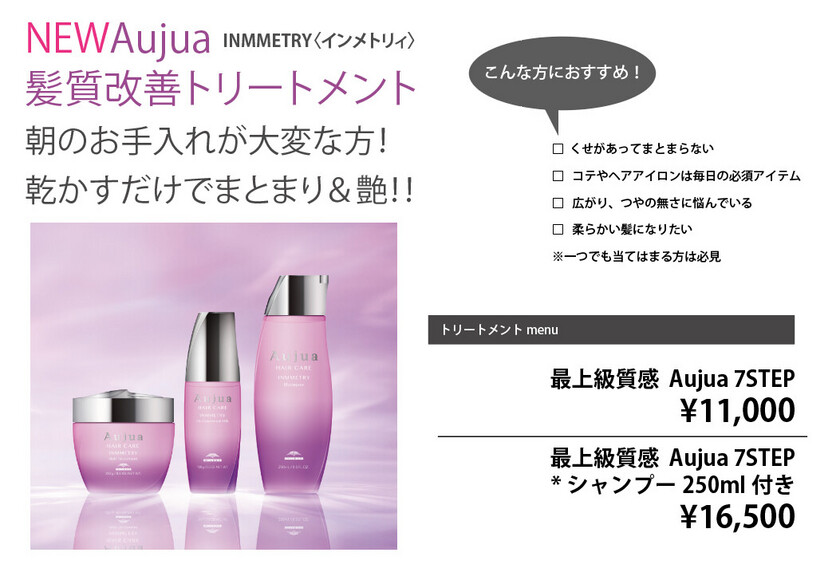 乾かすだけで髪質が変わったと感じるほどのシャンプー.トリートメント.アウトバスがAujuaシリーズから登場しました。サロンケア も7ステップと充実の仕上がりが期待できます。髪の状態やなりたい仕上がりでココロのAujuaソムリエがご案内いたします。ご期待ください!